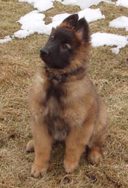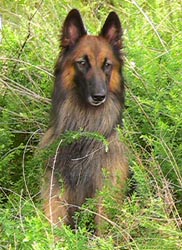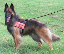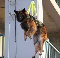 Bogey went home to Tennessee to join another Terv named Nina in doing lots of activities with Nikki and Tom. He made history at Sensation Belgians by being the first litter from which we didn't keep a puppy. He turned into a stunning dog with wonderful stable temperament. He took on his early Search & Rescue training like a seasoned pro, sometimes being the first dog to perform a technique (like the rappeling pictured below) while the more experienced dogs watched! |