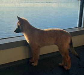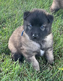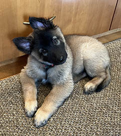 Remy was the biggest pup in the litter & had the nickname Lump Pup - he ate & slept, wasting no energy. Later on he was one of the most active wrestlers of the bunch, especially with his brother. He is now a sweetheart with an active social life, visiting new places & people with Claire & Jeff. He's even gets to go boating with them! |